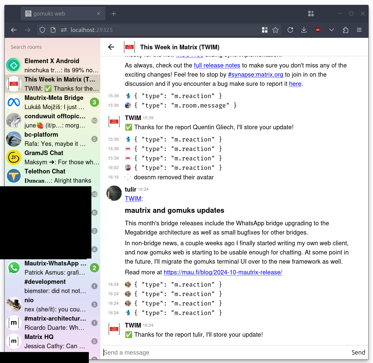 In non-bridge news, a couple weeks ago I finally started writing my own web client, and now gomuks web is starting to be usable enough for chatting. At some point in the future, I'll migrate the gomuks terminal UI over to the new framework as well.